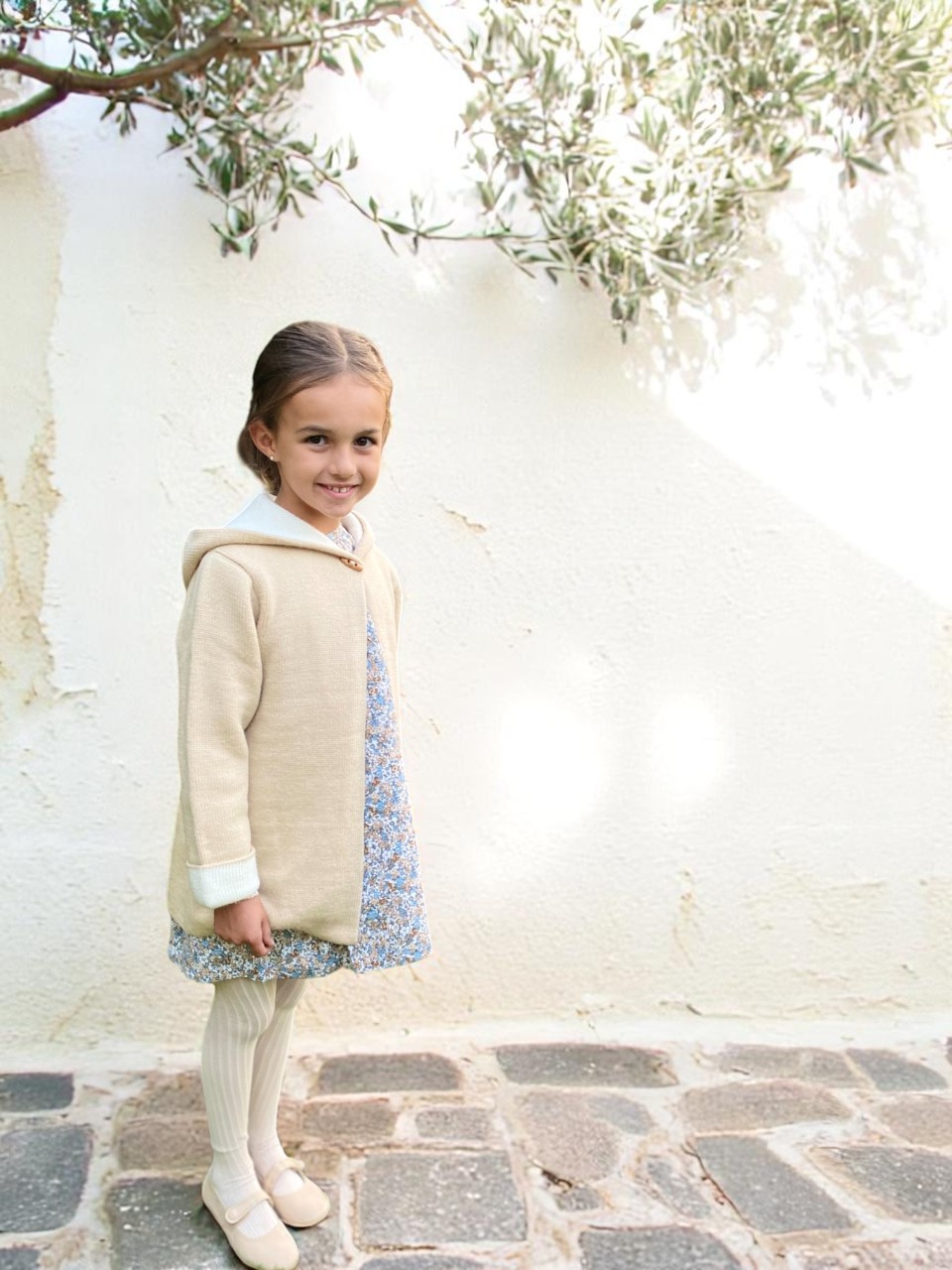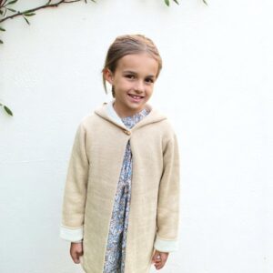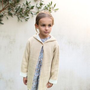 Abrigo doble beige-crudo, con capucha. Botón de Madera
