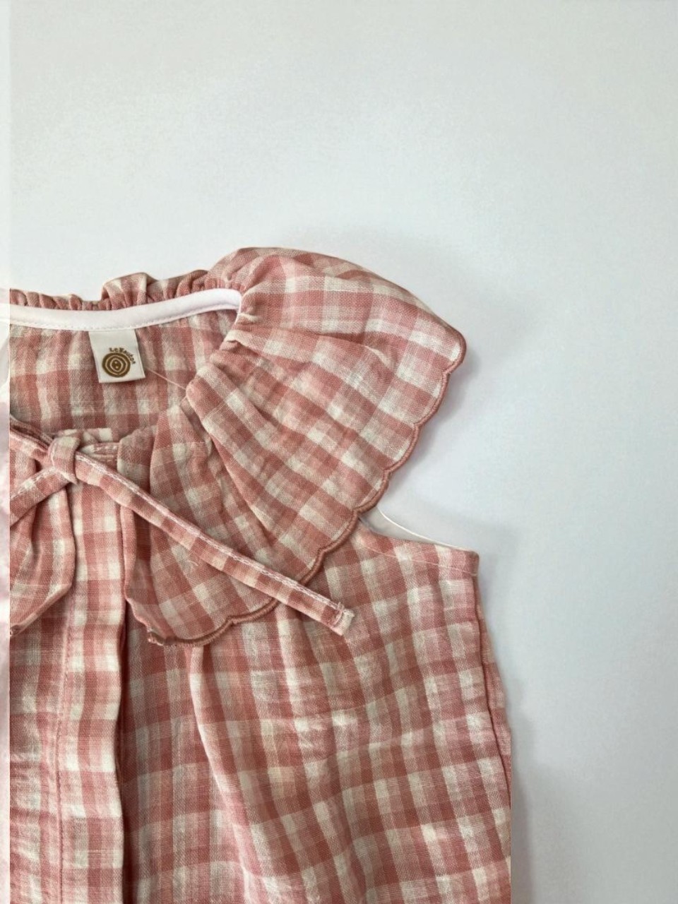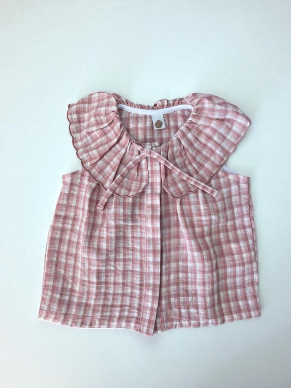 Blusa cuadrillé rosada, detalle cuello y bordado.