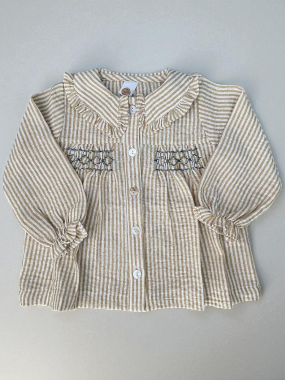 Blusa rayada beige con blanco, detalle nido abeja en color celeste.