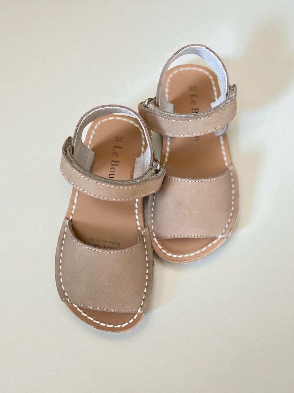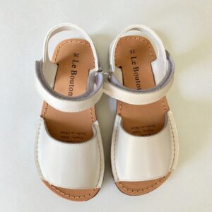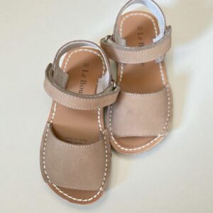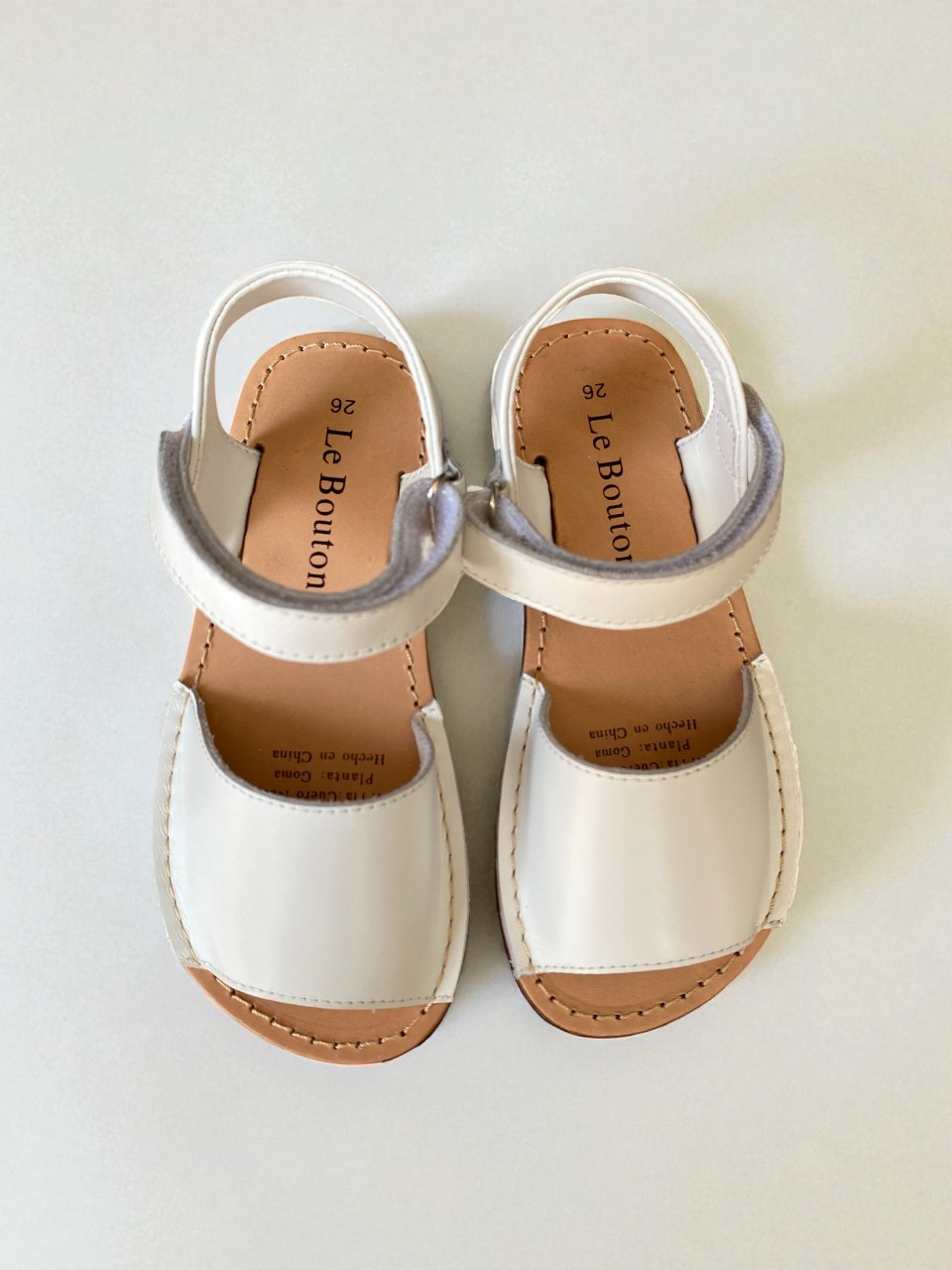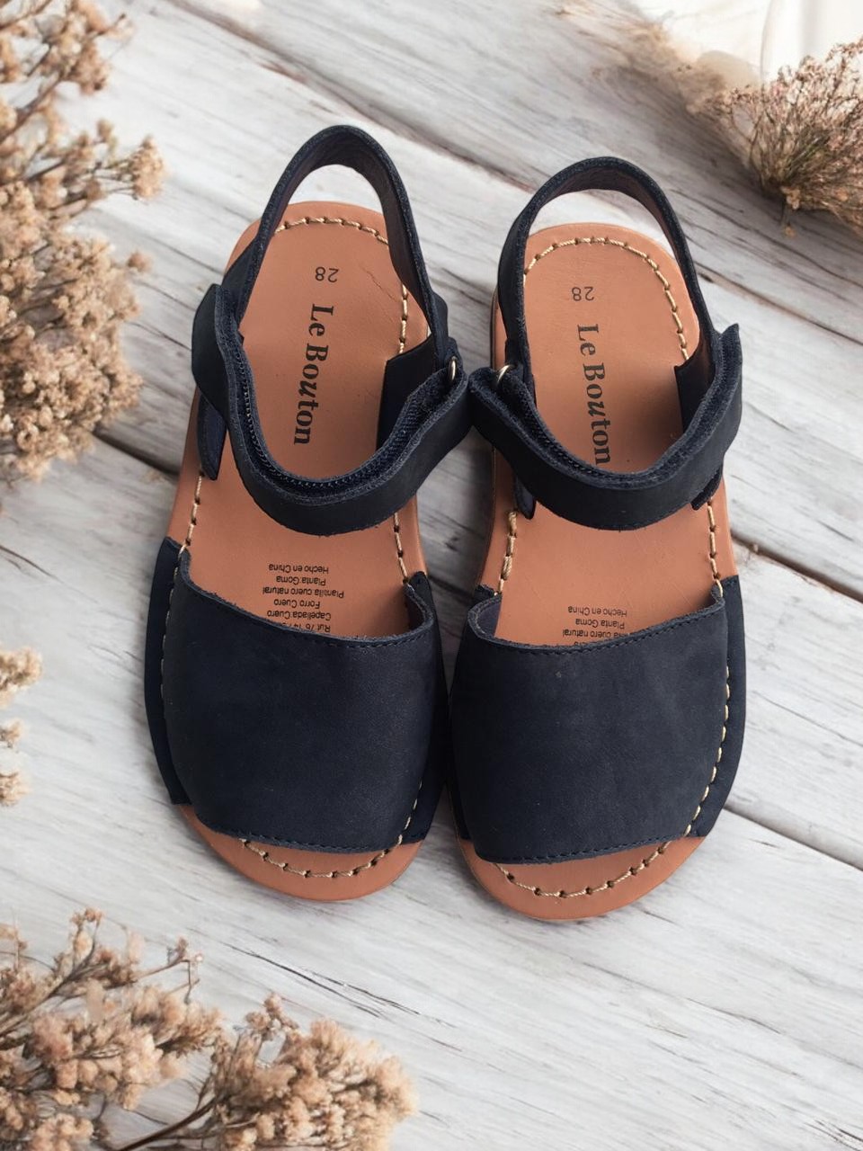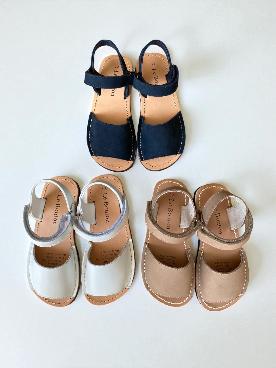 Chalitas modelo menorquina, de gamuza en colores azul y beige, y cuero en el color blanco. Cierre con velcro.