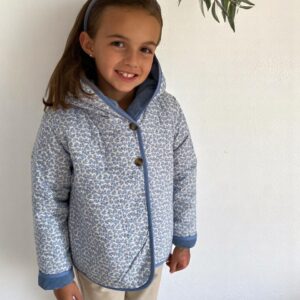 Chaquetón celeste acolchado de cotelé, con capucha y reversible con tela hojas.