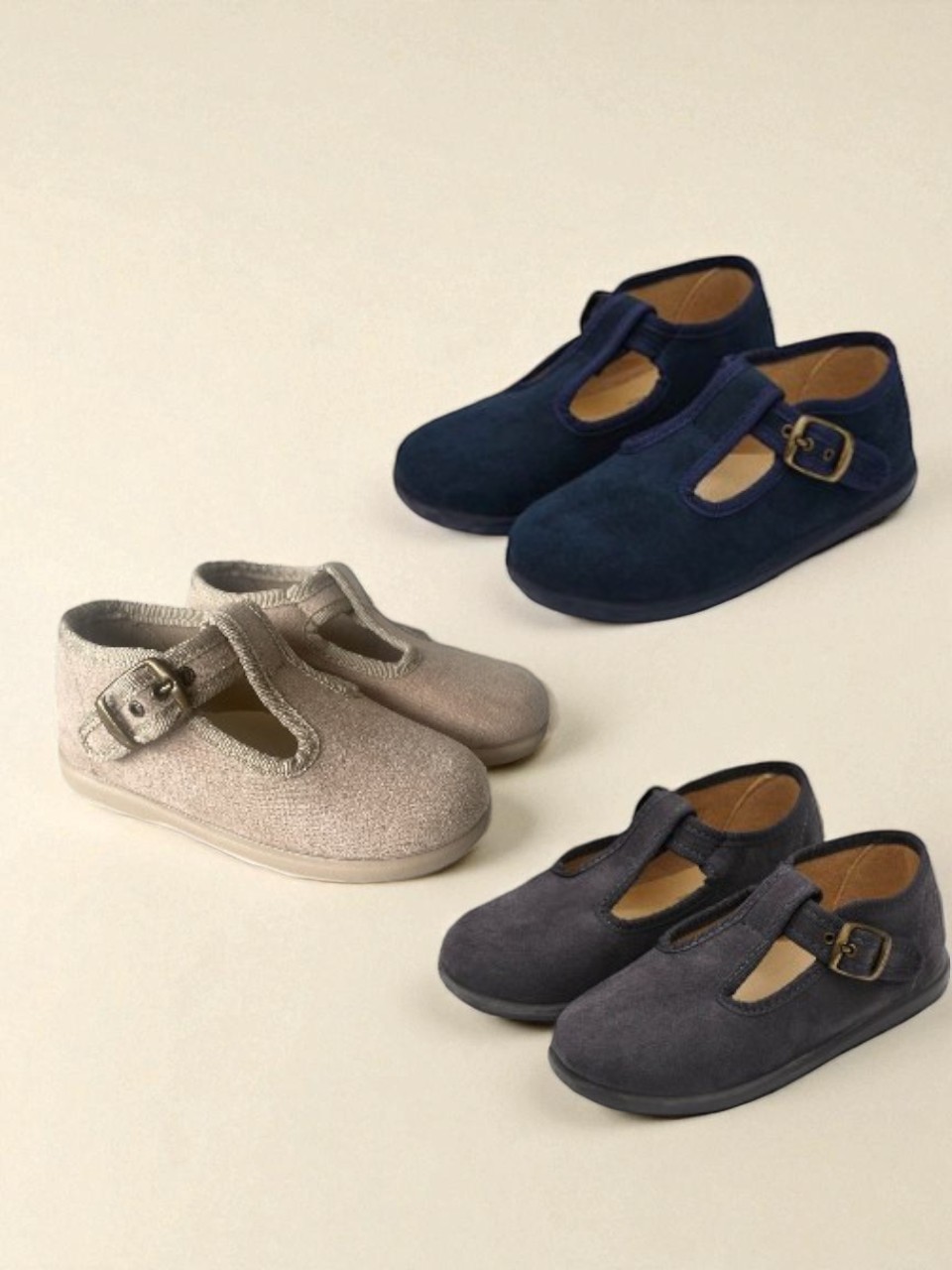 Pepito de gamuza con suela de goma. Correa con hebilla ajustable, disponible en colores azul marino y beige.