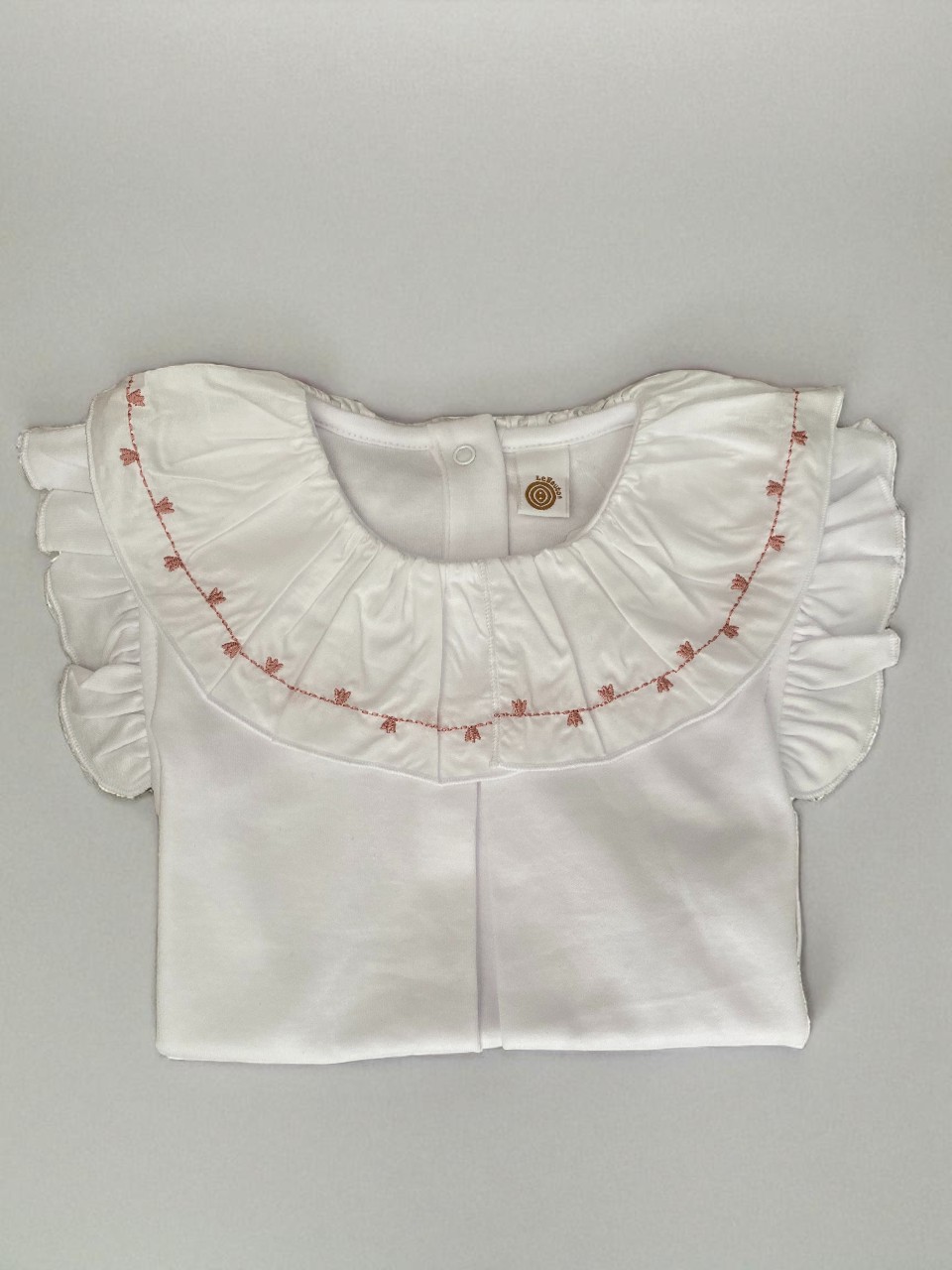 Polera Blanca de algodón peruano, cuello bordado en tono rosa palo.