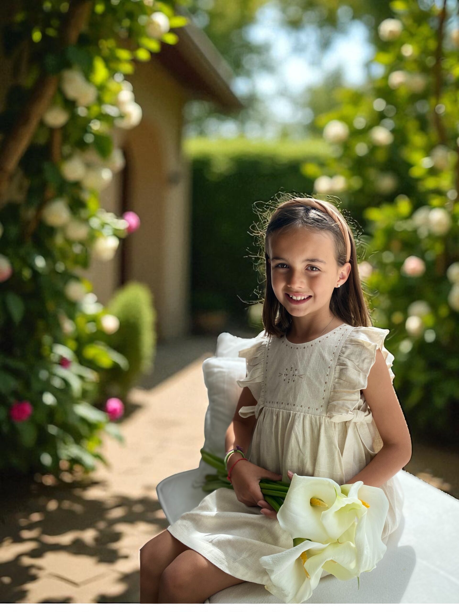 Vestido de lino beige bordado en tono beige y crudo. Ideal para ocasiones especiales.